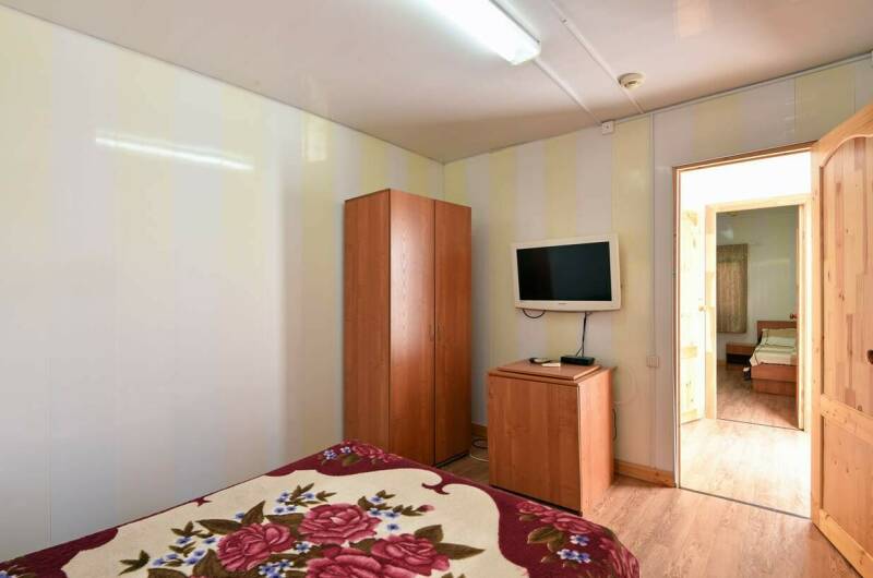 Все домики одинаковые по планировке и количеству мест. В каждом домике небольшая прихожая, санузел с душем и две изолированные спальные комнаты.