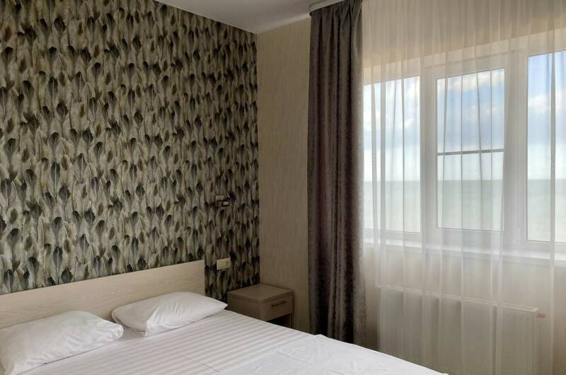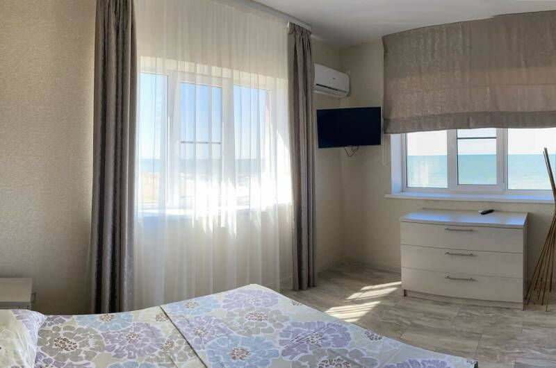 За минуту вы дойдёте от номера до пляжа. Пляж песочек с мелкой ракушкой, для наших гостей оборудован шезлонгами и зонтами, плавный вход в море удобен для детей и взрослых. Береговая полоса более 5 км зазывает совершать променады вдоль моря на закате и не только.