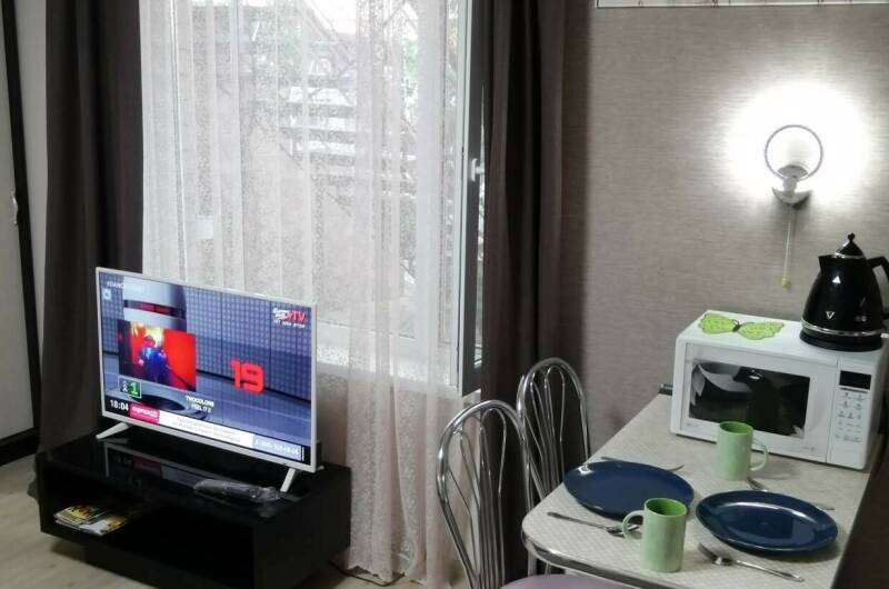 В нашем небольшом доме. очень тенистый и уютный дворик, с небольшой детской площадкой. Кабельное телевидение 160 каналов, с детскими телеканалами. На всей территории бесплатный Wi-Fi. В каждом номере-студии: индивидуальная кухня-микроволновка, чайник, плита, необходимый набор посуды и стиральная машина, двуспальная кровать и 2 кресла-кровати, шкаф для одежды. В номере-бунгало: 4 комнаты (2 спальни и 2 гостиные), ванная комната, кухня, вся необходимая бытовая техника, индивидуальная беседка. Во дворе большая беседка с плетёной мебелью и садовые качели. В соседнем здании столовая. В районе несколько продуктовых магазинов, столовые, кафе. Всё в пяти минутах ходьбы.