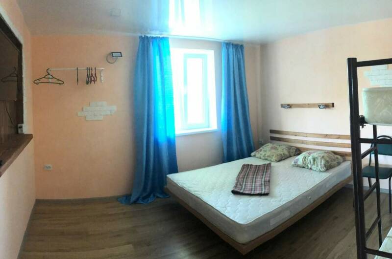 В первом двухэтажном доме разместились 6 комнат категории «Эконом», оборудованные двумя односпальными кроватям и вентилятором для отдыха 2 человек. На террасе 1 и 2 этажа, объединяющей по 3 комнаты установлены места для отдыха и телевизор для общего просмотра.
