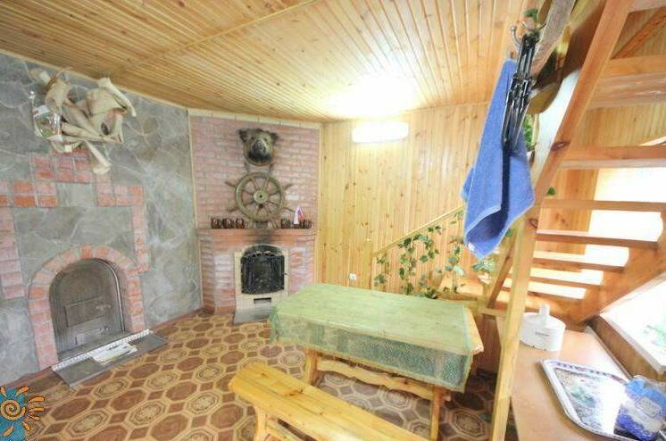 Второй двухэтажный домик с собственной душевой комнатой предназначен полностью к сдаче и представляет категорию «Комфорт». В просторном холле с камином первого этажа установлен большой обеденный стол, а на втором этаже оборудована спальная комната с телевизором, двуспальным раскладным диваном и двумя односпальными кроватями для размещения 4 человек.