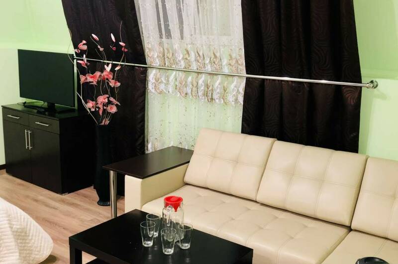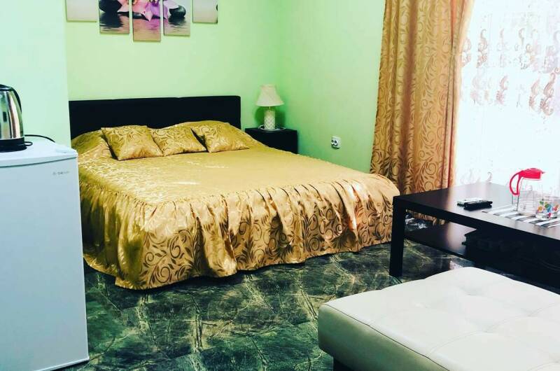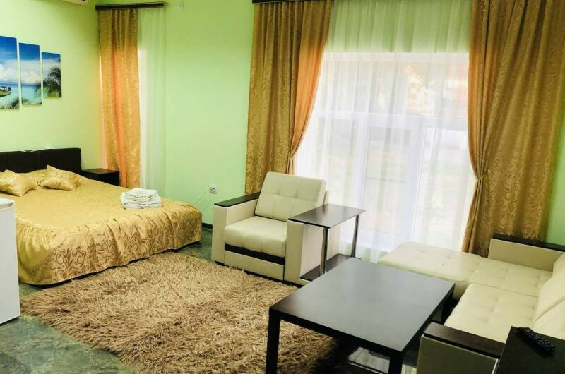 Комфортные, современные и уютные 2−3-х, 4-х местные номера оснащены удобной мебелью, пастельными принадлежностями, сплит-системой, телевизором, эл. чайником, фен (номера люкс), Wi-Fi, обеденной зоной на свежем воздухе, сушкой для белья (на улице). Современный дизайн номеров располагает к уютной и спокойной атмосфере. Во дворе имеются- зона отдыха как в виде беседок, так и отдельные столики для пар на террасе, мангал, детская площадка с городком, горкой, домиком, качелями, батутом,