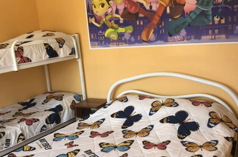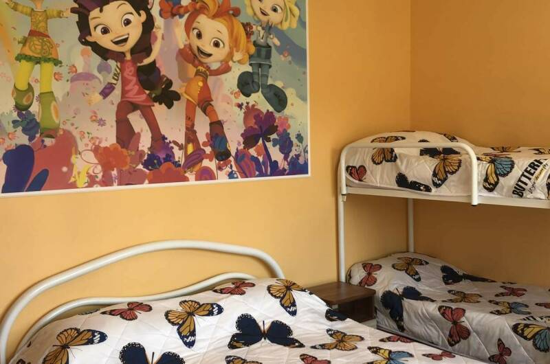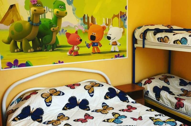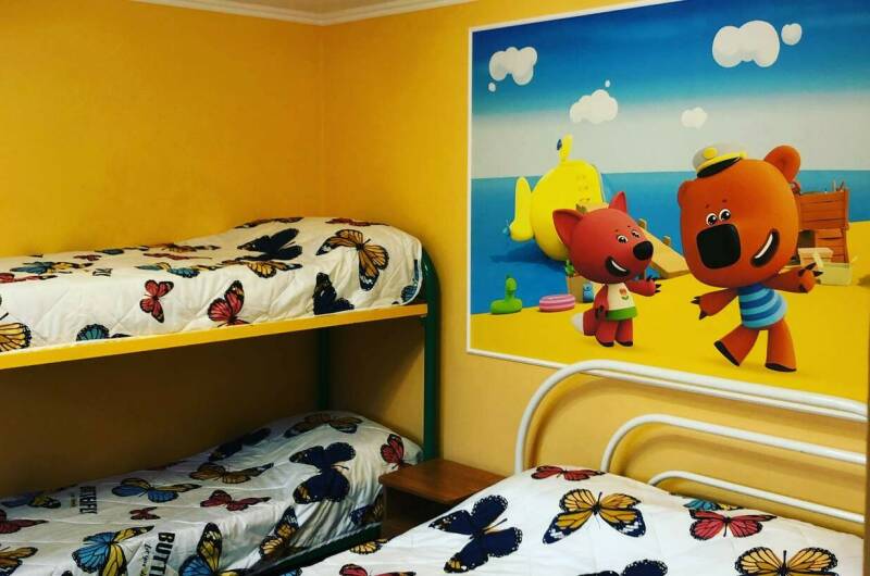 Во дворе две детские площадки с мягким покрытием: для подростков и малышей, много игрушек, большой детский бассейн, садовые деревья, цветы. Кухня с обеденной зоной во дворе под большим навесом. Посуда, электрическая варочная панель, стиральная машина, коляски, мангал — в общем пользовании бесплатно.